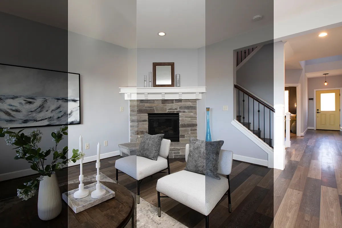 - Flash exposure — The photographer fires a flash or speedlight to evenly illuminate the interior. This removes shadows and brings out natural colors in the walls, floors, and furniture.